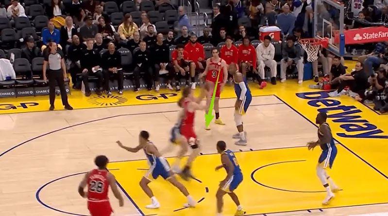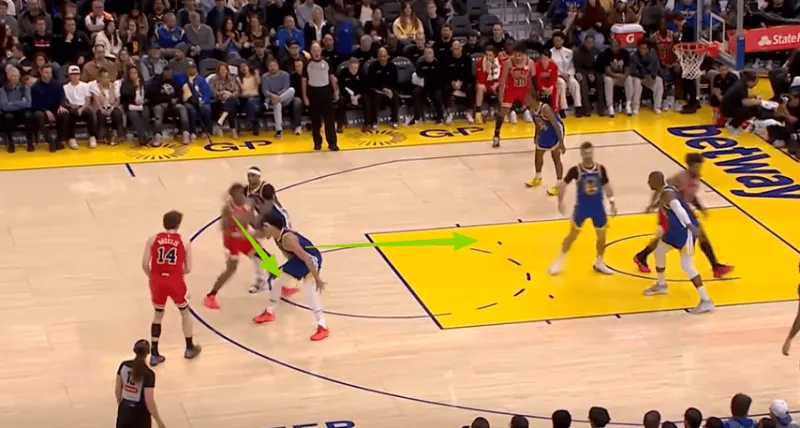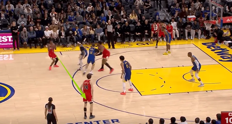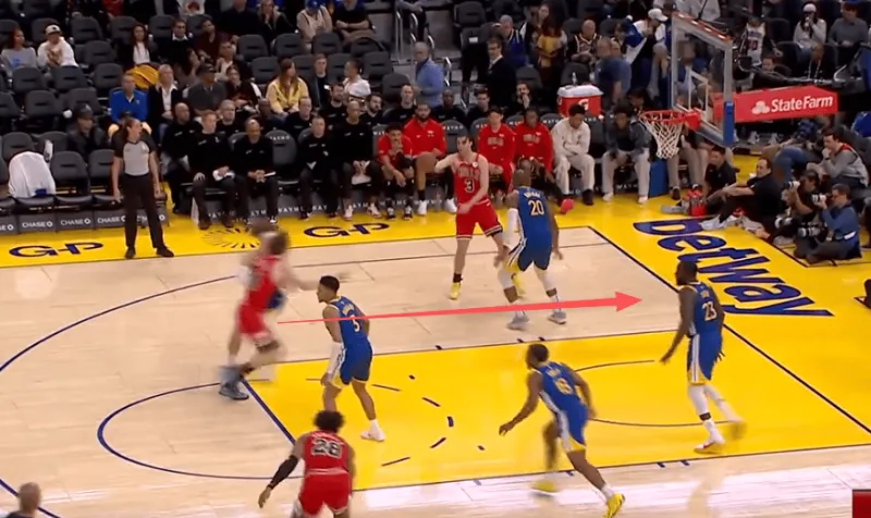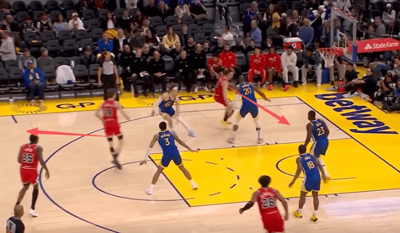 迪林汉姆左翼持球与亚布塞莱发动挡拆配合,被勇士换防破解后立即出球给弱侧接应的布泽利斯,