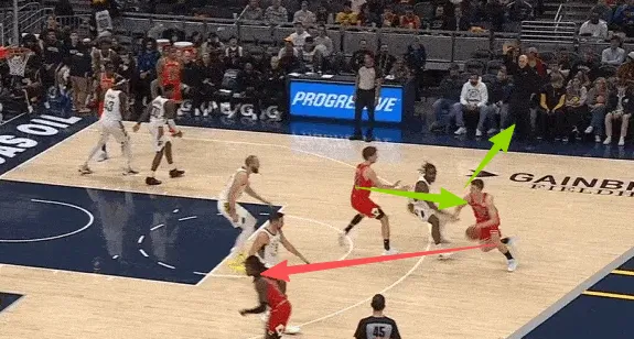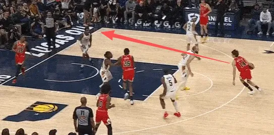队友清空一侧,吉迪与布泽利斯在左翼发动边路二人转配合:布泽利斯先是为吉迪设置“Touch Screen”,随后佯装外弹兜至三分心外为突破的吉迪拉开空间,
